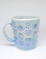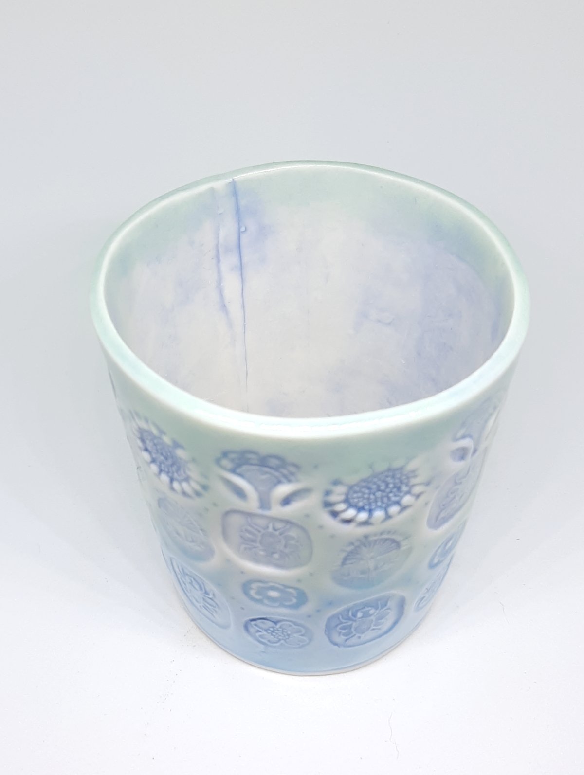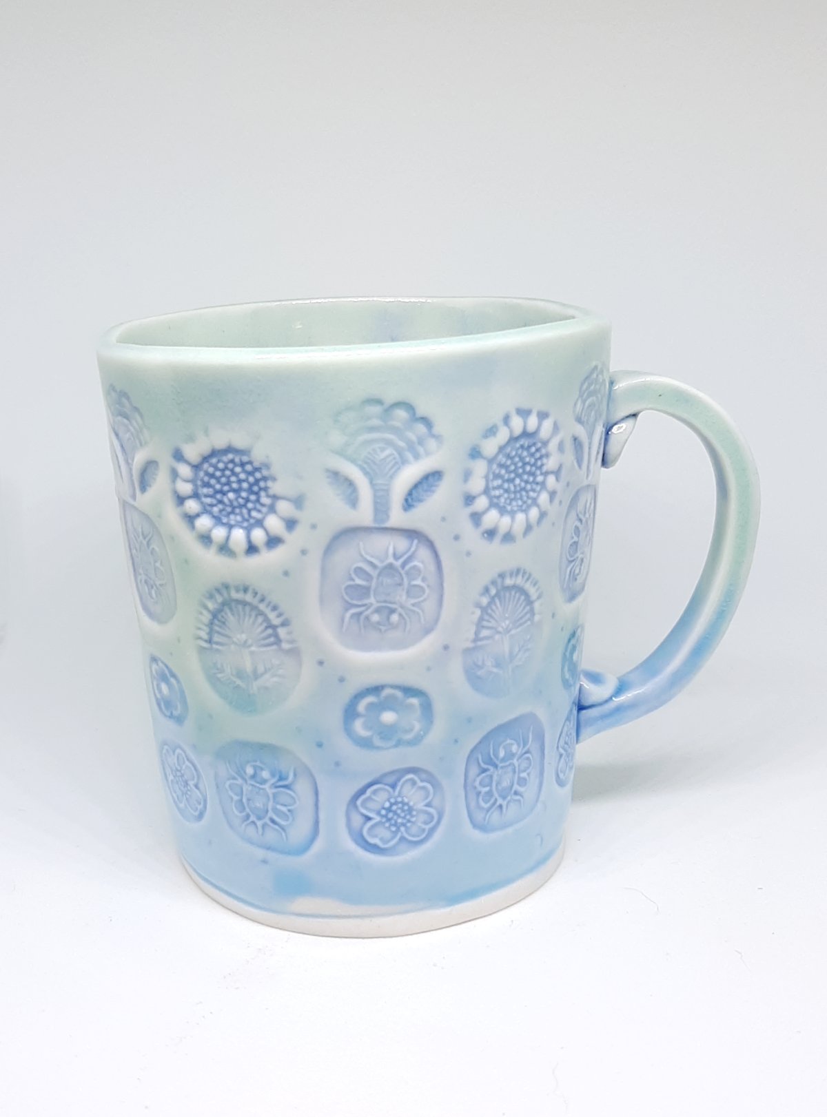 A mug stamped with flowers and flying bugs. Glazed inside with a watercolor-esque wash of light blue.